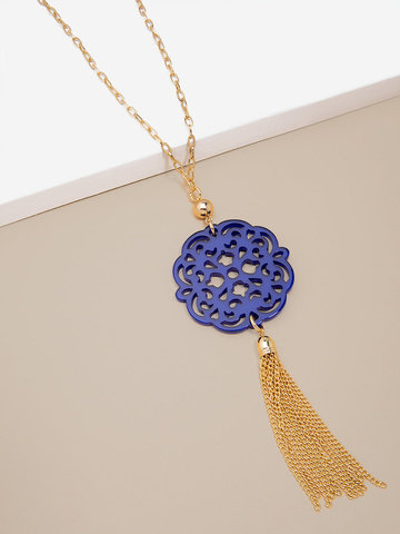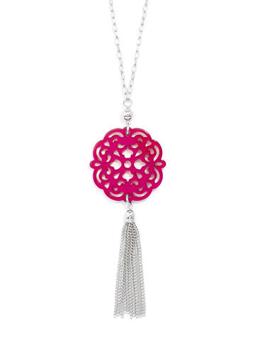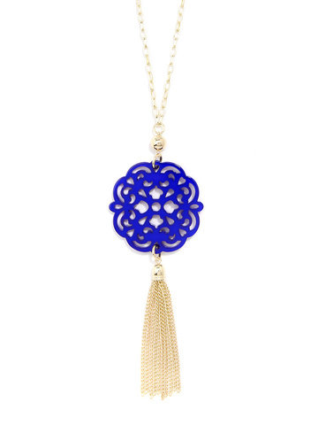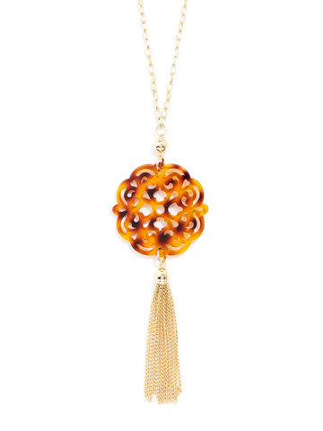 Long, shiny metal necklace with resin pendant in Allure cut-out design and metal tassel