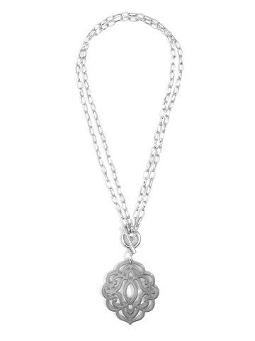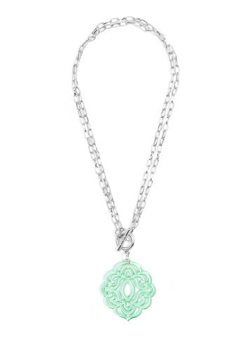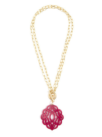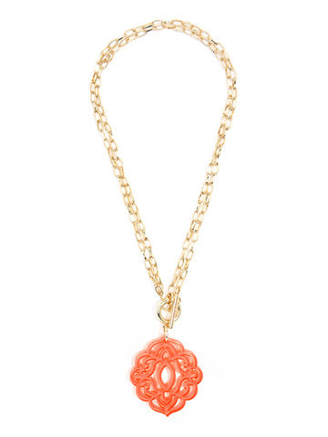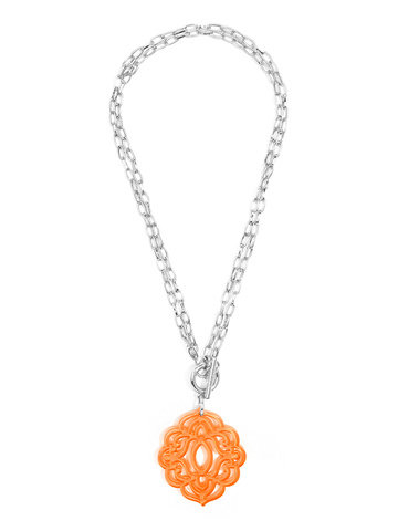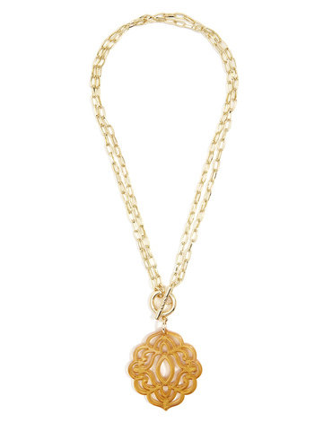Long, shiny metal chain necklace with baroque-style resin pendant.