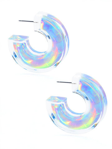 Open hoop earring made from premium grade lucite and embellished with gold and silver foil inside. The silver style is holographic.
