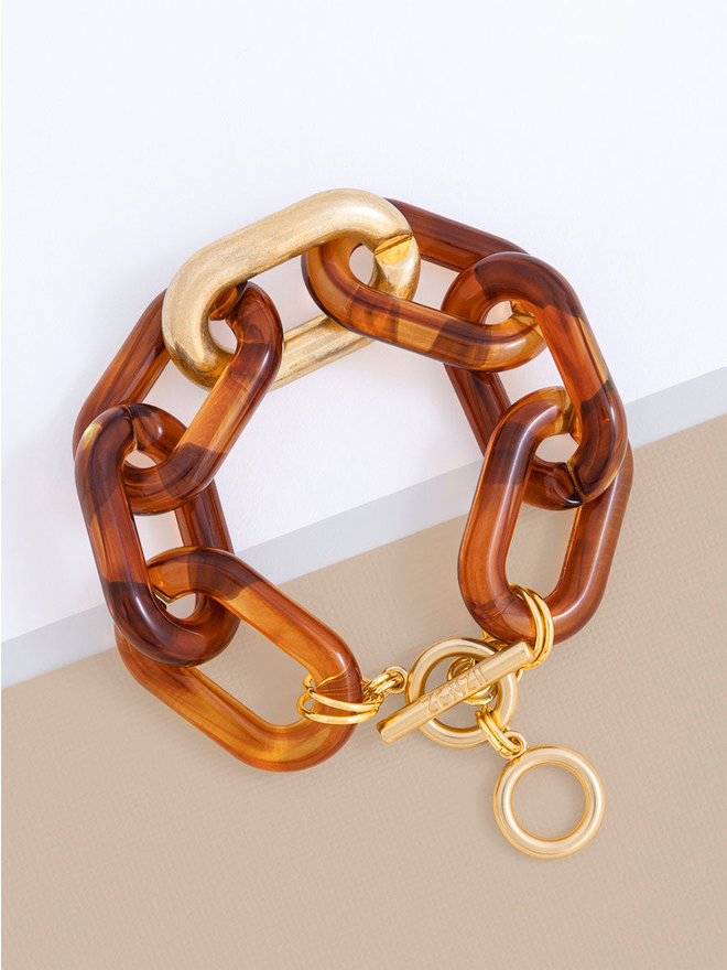 Chunky toggle bracelet featuring tortoise patterned links with a single 18K burnished gold link.