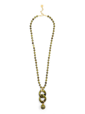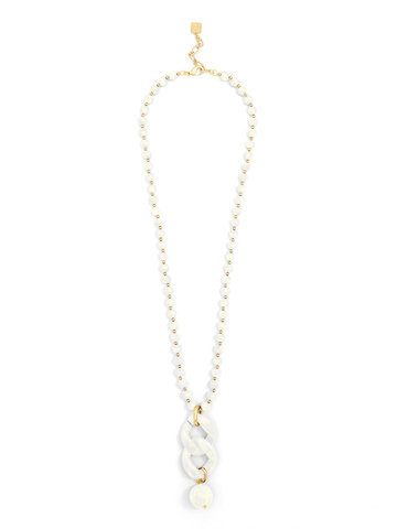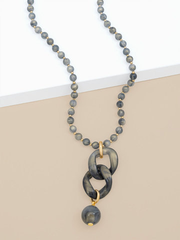 Iridescent beaded long necklace embellished with two curb chain links and a bead charm.