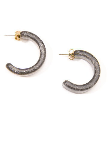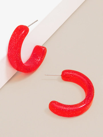 Small, half hoop earring made of resin with colored glitter inside. Lightweight and features gold post back.