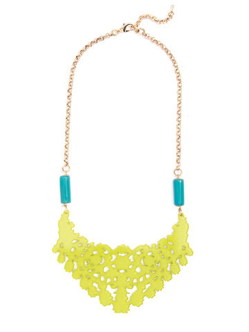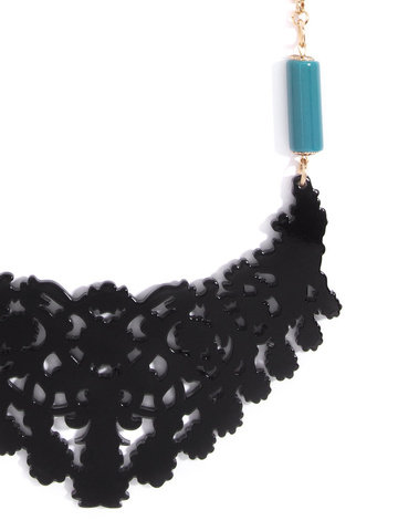 Classic lace takes a twist with this laser cut resin bib necklace in a variety of colors.