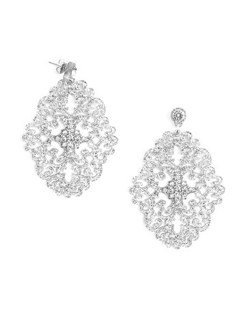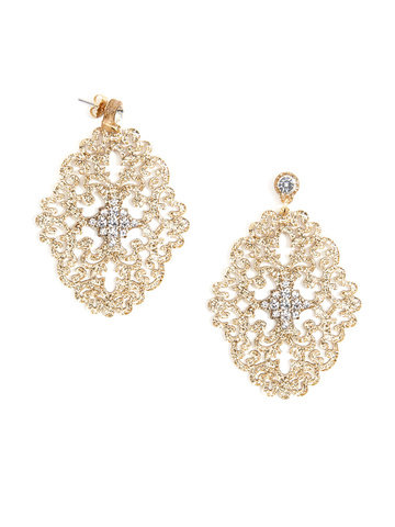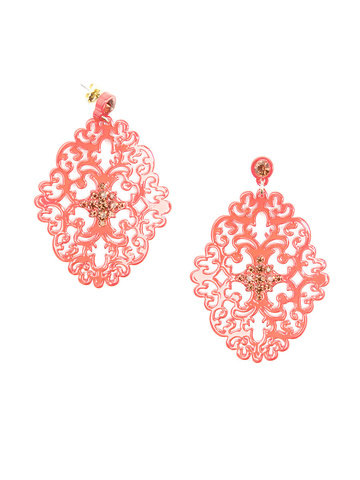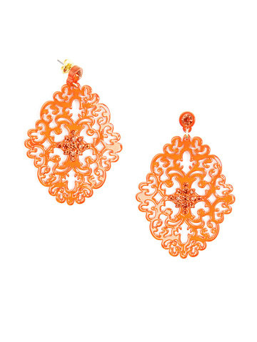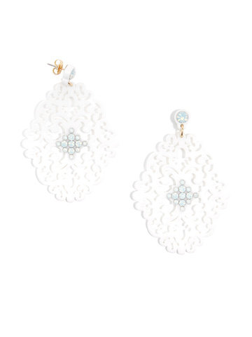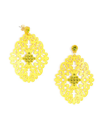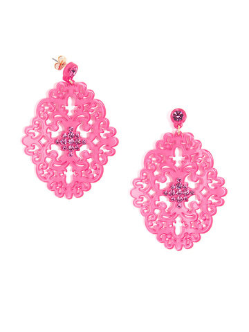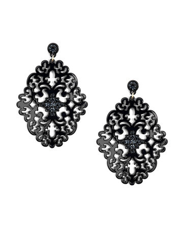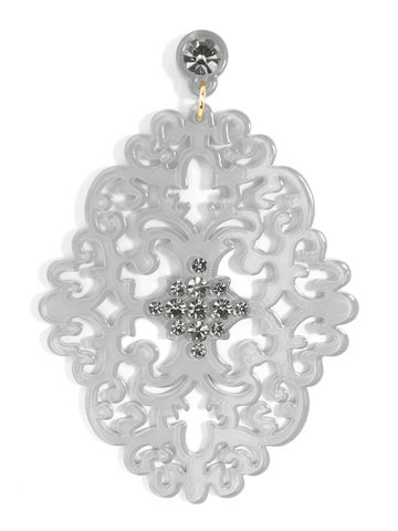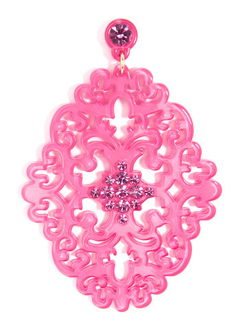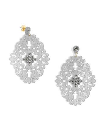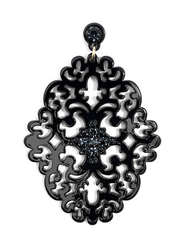 Large statement earring with crystal embellishments on top of brocade patterned, premium-grade resin.