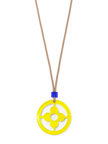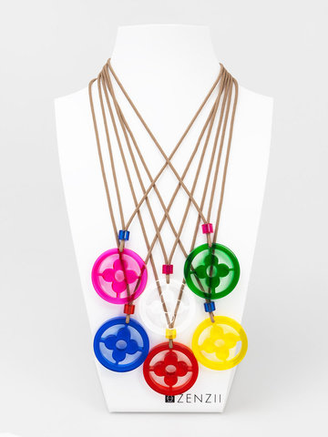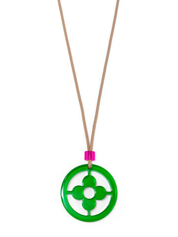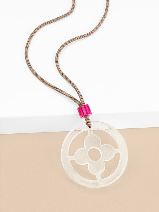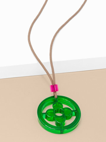 Adjustable long necklace fearring a lucite clover cutout pendant.