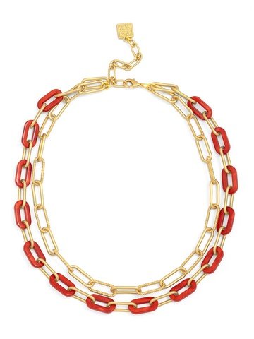 18K gold plated collar necklace designed with layers of metal and marbled resin link links.