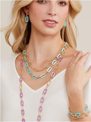 18K gold-plated long necklace composed of marbled resin and metal paperclip links finished with a lobster claw closure.