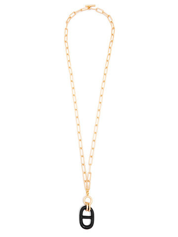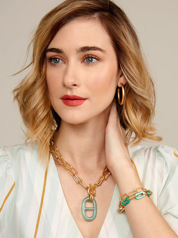 Matte gold link necklace embellished with a resin charm. This style can be worn long or short.