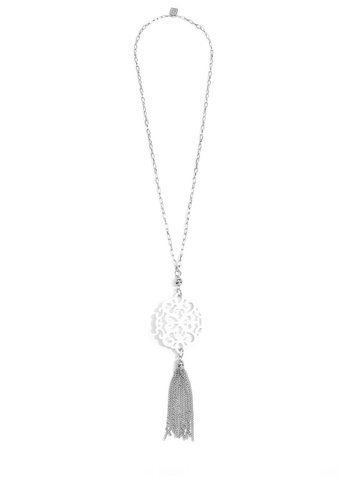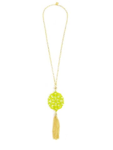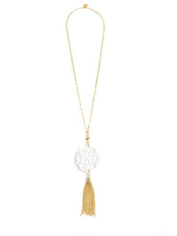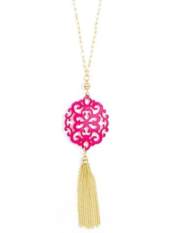 A modern twist on a classic pattern, this damask pendant comes in a variety of colors and is accented with a a chain tassel.