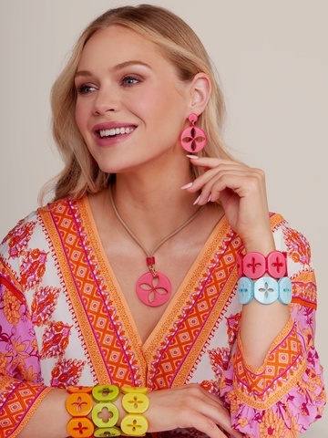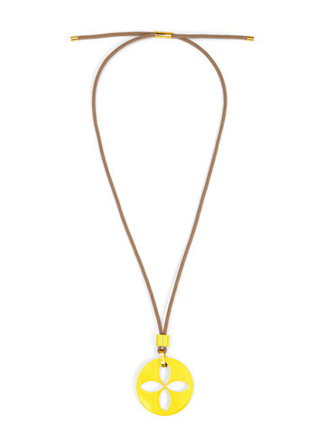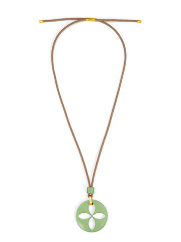 Adjustable long necklace fearring a unique quatrefoil cutout pendant.