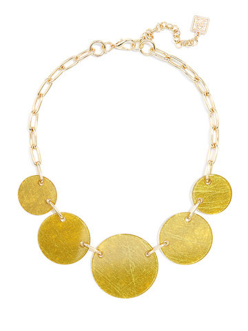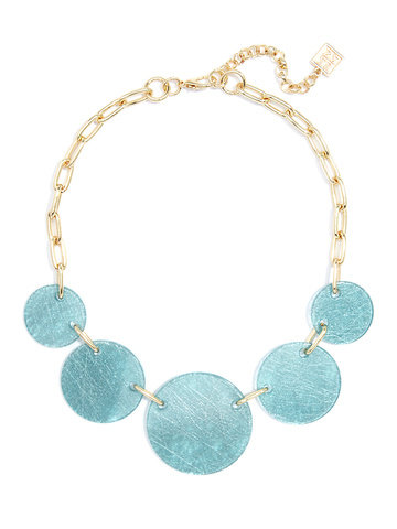 Collar necklace of flat acrylic circles with compressed metallic silk for a static effect.