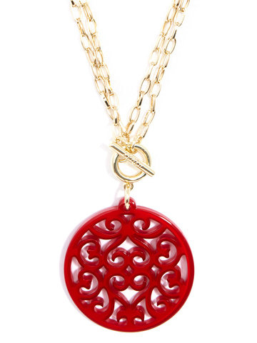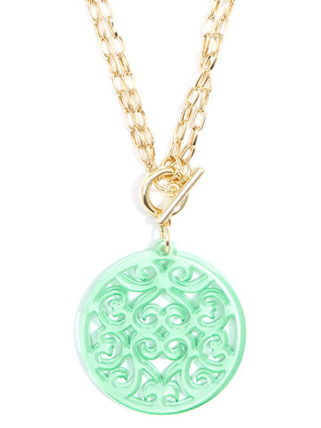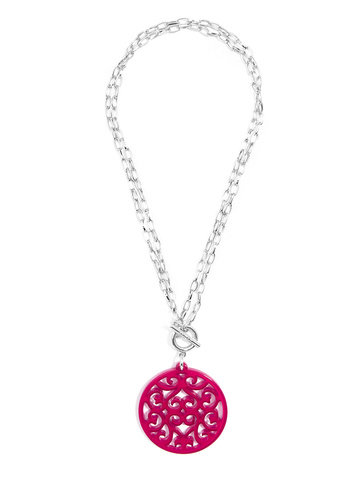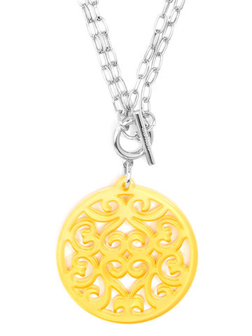 Long, shiny metal chain necklace with a resin pendant in Swirled Circle design. Can be worn as a long necklace or collar necklace.